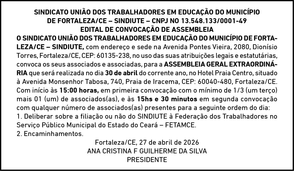 O SINDICATO UNIÃO DOS TRABALHADORES EM EDUCAÇÃO DO MUNICÍPIO DE FORTALEZA/CE – SINDIUTE, com endereço e sede na Avenida Pontes Vieira, 2080, Dionísio Torres, Fortaleza/CE, CEP:...