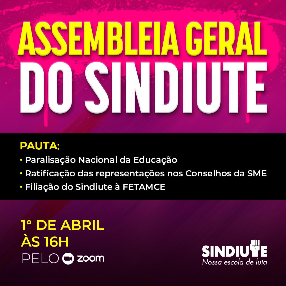 Atenção, trabalhadores e trabalhadoras em educação filiados/as ao SINDIUTE! Dia 1o de abril, próxima quarta-feira, às 16h, o sindicato realizará uma assembleia virtual...