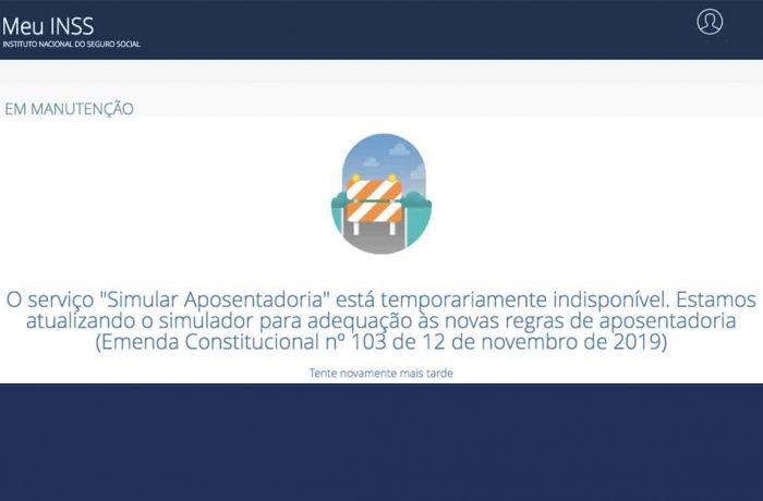 O site Meu INSS, no entanto, só permite fazer agendamentos. Quando clica em Simular Aposentadoria, a página informa que o serviço está temporariamente indisponível. “Estamos atualizando o simulador para adequação às novas regras de aposentadoria (Emenda Constitucional nº 103, de 12 de novembro de 2019)”, informa.