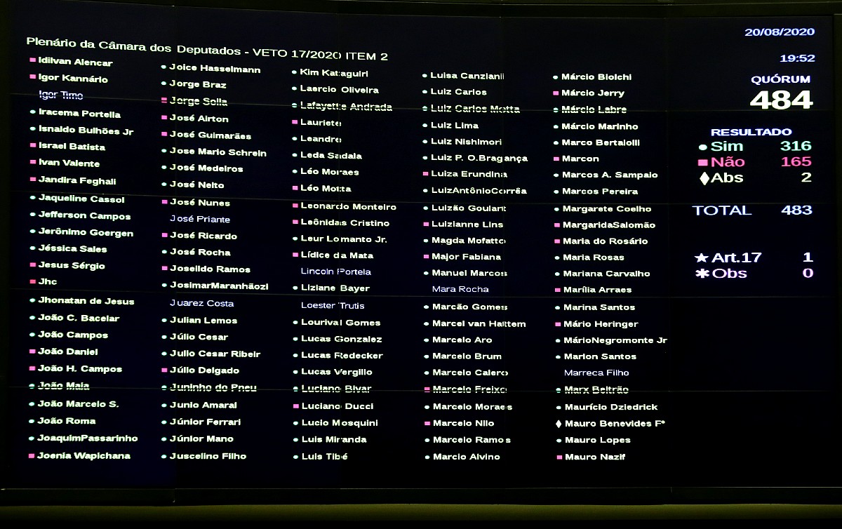 Para que um veto presidencial seja derrubado, é preciso que as duas Casas cheguem ao mesmo resultado em suas votações, por maioria simples. Na Câmara, foram 316 votos a favor da manutenção dos vetos e 165 contra. Para garantir esse apoio, o governo negociou ao longo do dia usando a prorrogação do auxílio emergencial durante a pandemia, o socorro financeiro a estados e municípios e a liberação de recursos do Orçamento para emendas parlamentares para manter o veto.