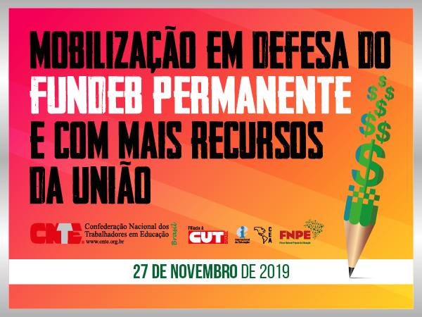 A Confederação Nacional dos Trabalhadores em Educação (CNTE) lançou o Dia Nacional de Mobilização pelo Novo Fundeb – 27 de novembro. O Fundo de Manutenção e Desenvolvimento da Educação Básica e de Valorização dos Profissionais da Educação (Fundeb) tem vigência assegurada até 31 de dezembro de 2020. Após essa data, o regime de cooperação ficará extinto, podendo comprometer gravemente o financiamento da educação em todo país.