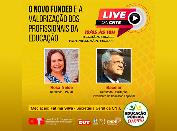 #LIVEdaCNTE | “O Novo Fundeb e a valorização dos profissionais da educação” é o tema da LIVE da CNTE no próximo dia 19 de maio, às 18h. Participam do debate a deputada Rosa Neide (PT/RN) e o deputado Bacelar (PODE/BA). Compartilhe!