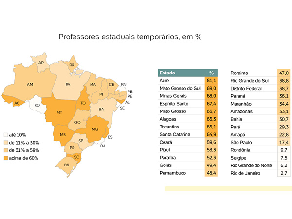 O Plano Nacional de Educação, aprovado em 2014, tinha como meta que as redes tivessem até 2017 apenas 10% de seu corpo docente como temporário. Mas, em 2018, apenas quatro redes estaduais atendiam esse objetivo: Rio de Janeiro, Rio Grande do Norte, Sergipe e Rondônia.